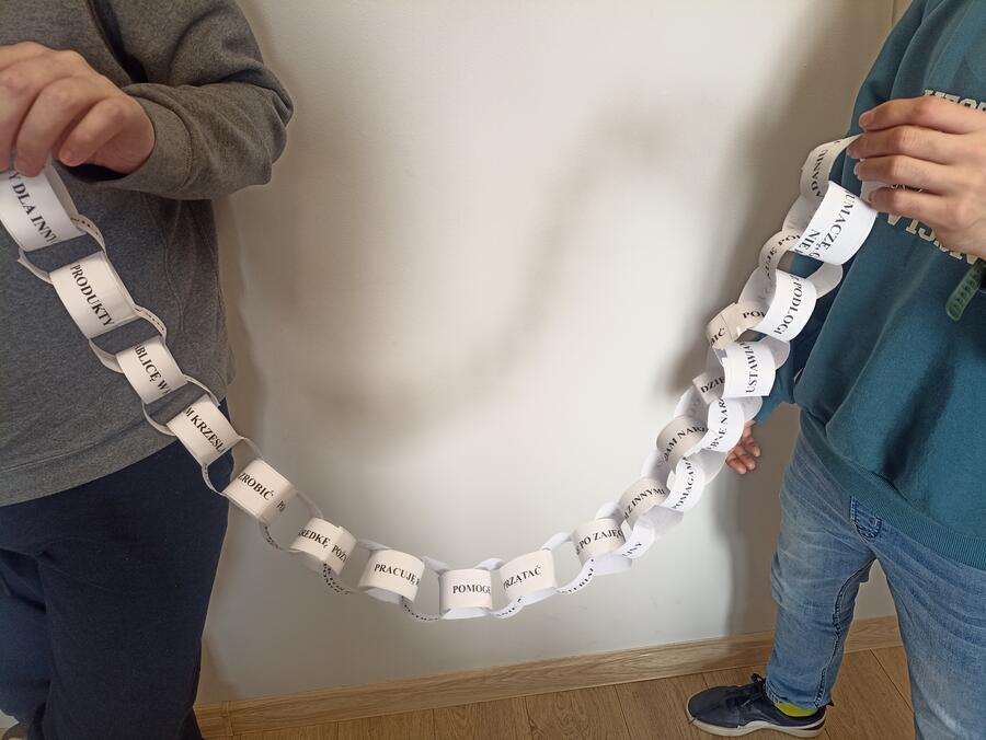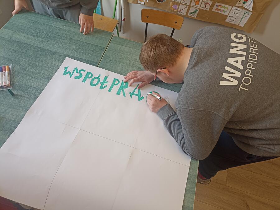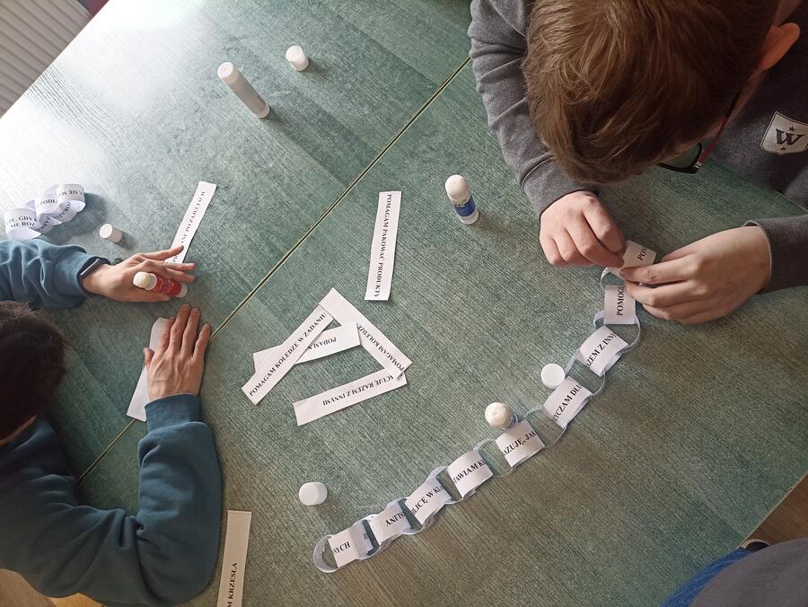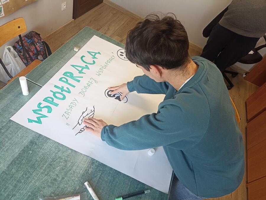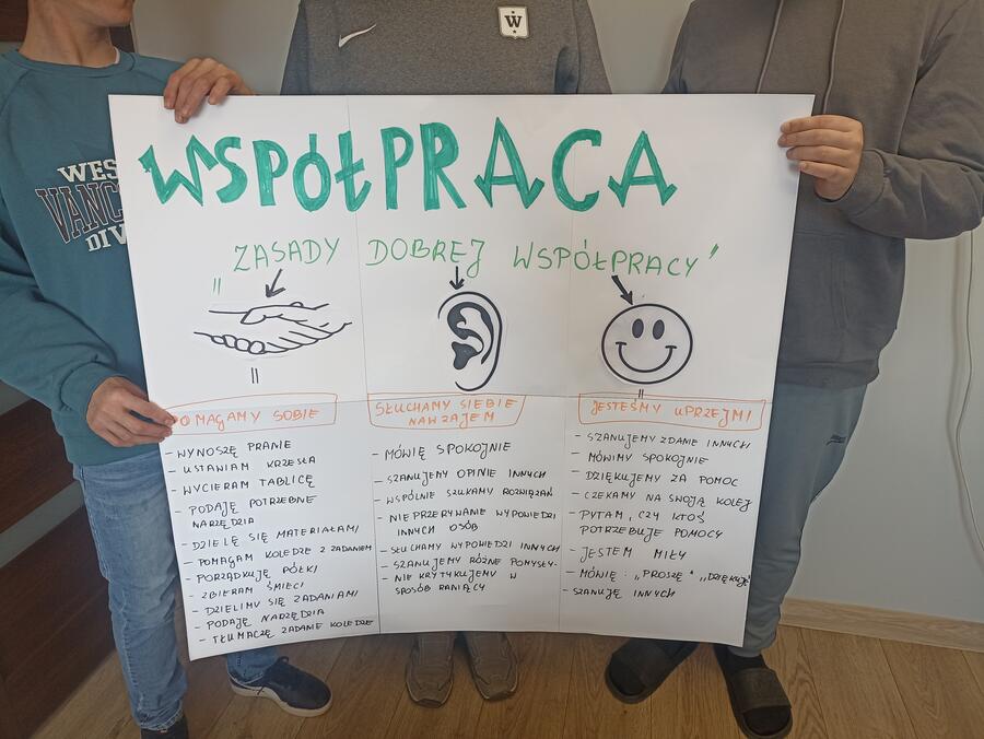 Podczas zajęć uczniowie rozwijali umiejętność współpracy poprzez różnorodne działania praktyczne. Wspólnie stworzyli plakat „Zasady dobrej współpracy” oraz wykonali ćwiczenie „Łańcuch pomocy”, które podkreśliło znaczenie zaangażowania i wzajemnego wsparcia w grupie.