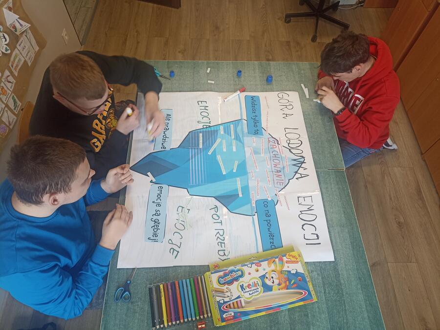 Drugie spotkanie dotyczyło rozpoznawania emocji, ich nazywania oraz sposobów radzenia sobie z trudnymi uczuciami. Zajęcia miały charakter praktyczny i angażowały uczniów do aktywnego udziału. Na początku uczniowie wykonali ćwiczenie „Jak się dziś czujesz i jaką emotką dziś jesteś?”, wybierając emotki odzwierciedlające ich samopoczucie. Następnie wykonali zadanie „Góra lodowa emocji”, dzięki któremu poznali zależność między zachowaniem a ukrytymi emocjami i potrzebami. W kolejnej części stworzyli „Kodeks złości”, zapisując konstruktywne sposoby radzenia sobie z trudnymi emocjami. Zajęcia sprzyjały rozwijaniu samoświadomości, empatii oraz umiejętności bezpiecznego wyrażania emocji.